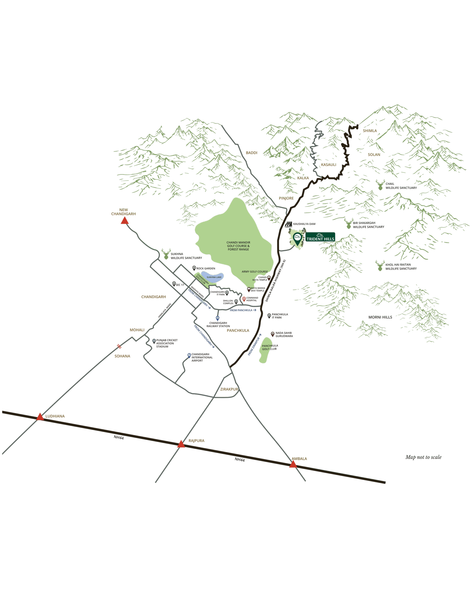 Trident Hills – Luxury Lifestyle. Unspoilt Nature. Situated at the foot of the Shivalik range in Panchkula, Trident Hills is an integrated 200-acre township that couples luxury living with unspoilt nature. Providing luxury low-rise floors, large plots, and resort-like amenities such as a clubhouse, spa, and lush greenery, it ensures a life of sophistication and serenity. With sweeping hill vistas, open blue skies, and more than 70% greenery, its residents have the ideal blend of contemporary comforts and the peace of nature—just a few minutes from Chandigarh but miles from the madness.